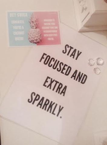 As you can see, I ended up picking the "Stay Focused And Extra Sparkly" slogan... It was either going to be this one or the "Messy Bun Get Things Done!" It was a hard decision but I thought my choice was more motivational and I happen to be obsessing over motivational quotes at the moment.